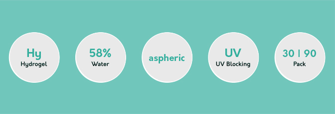 World’s best selling hydrogel material, etafilcon A with 58% water. HA(Hyaluronica Acide), the best
